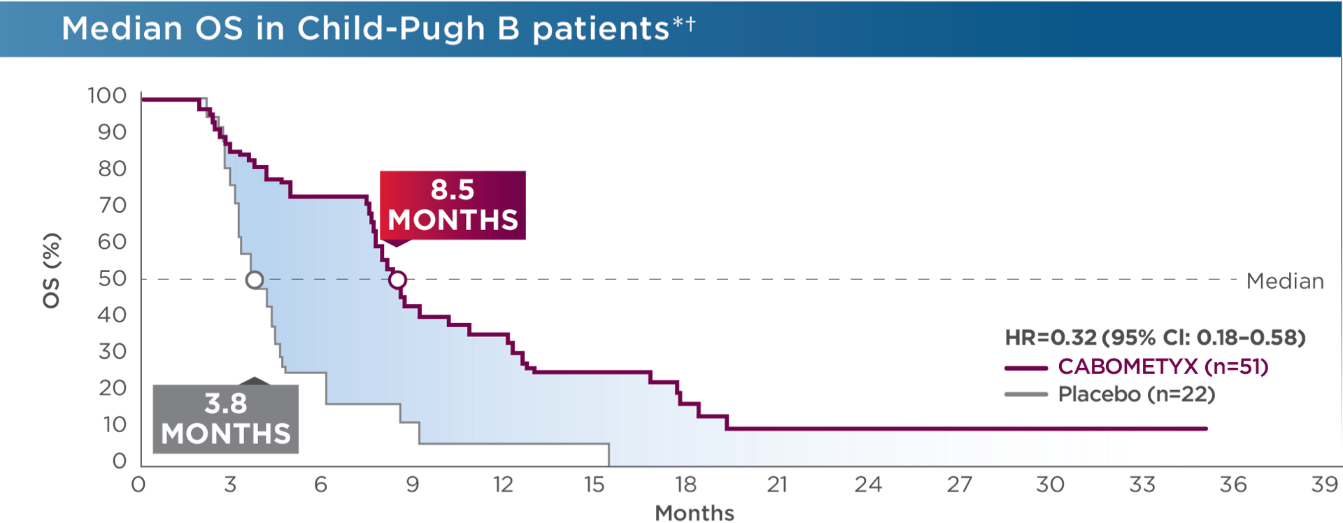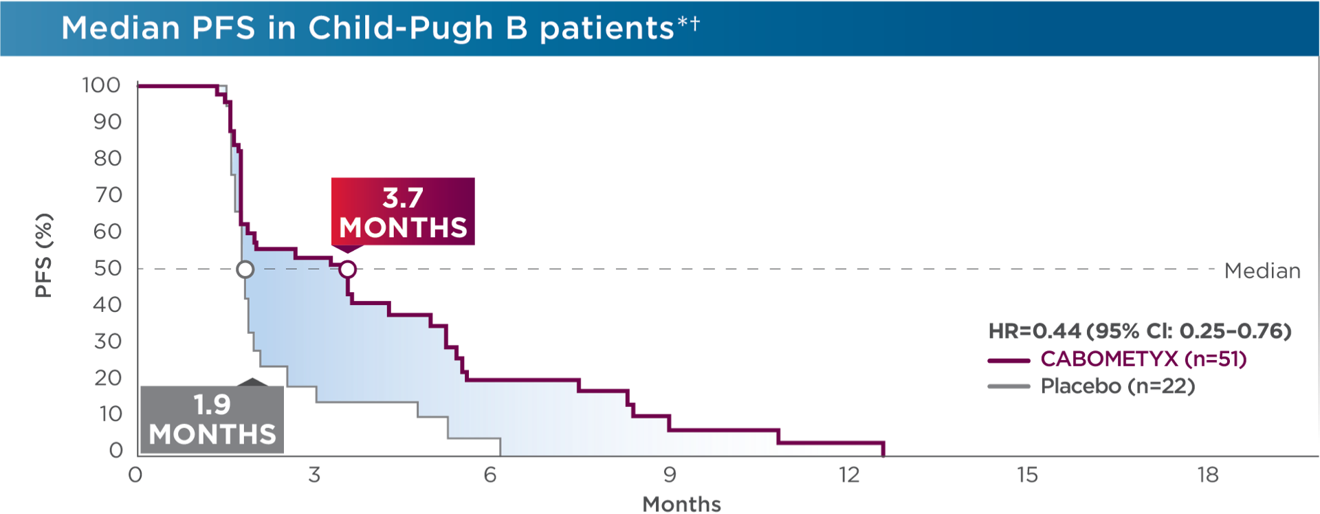 At the time of the first Child-Pugh assessment at Week 8 after randomization by the investigator, 51/470 patients in the CABOMETYX arm and 22/237 patients in the placebo arm had Child-Pugh B cirrhosis (ie, Child-Pugh B subgroup). Available values for the central laboratory-determined Child-Pugh B score points included Child-Pugh B7 (n=26 CABOMETYX arm, 11 placebo), B8 (11 CABOMETYX arm, 3 placebo), and B9 (3 CABOMETYX arm, 5 placebo).2 Child-Pugh grading was investigator assessed and scoring was by Exelixis, Inc. (study sponsor); some discrepancies between grading and scoring results existed.