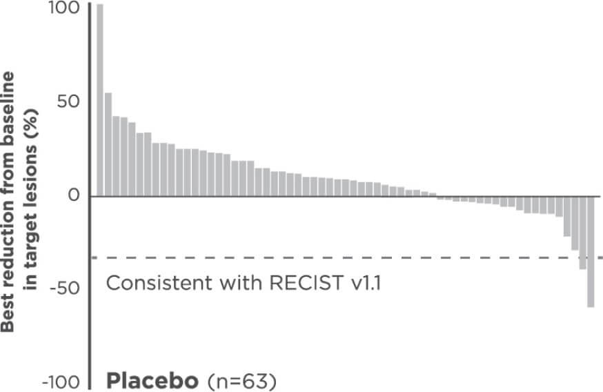 Best reduction is maximum reduction in sum of diameters of target lesions. Patients with target lesion at baseline and at least 1 on-treatment tumor assessment are included. Some patients are not represented due to lack of evaluable postbaseline assessment, censoring before first evaluable postbaseline assessment, lack of target lesions, and/or incomplete or inevaluable target-lesion assessment. Data from time points after the first date of any of the censoring events defined for the primary PFS analysis were excluded.3