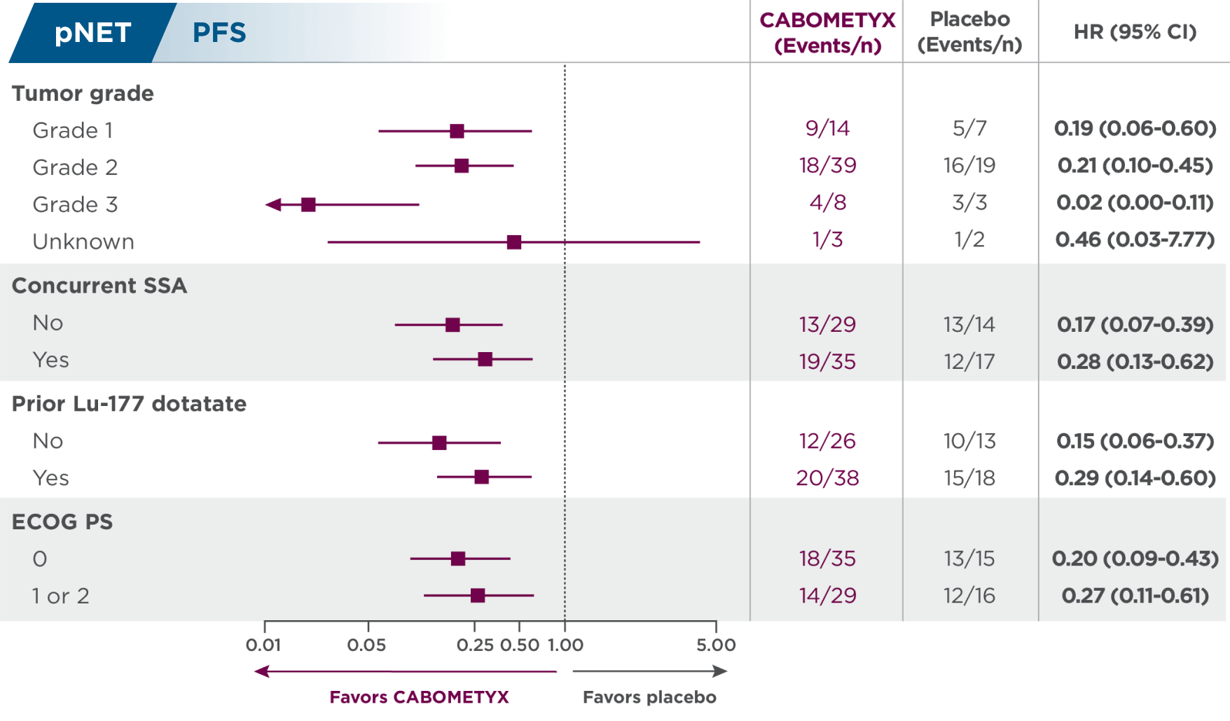 Of the 95 pNET ITT patients, 85 were evaluable (n=56 in the CABOMETYX arm, n=29 in the placebo arm).
