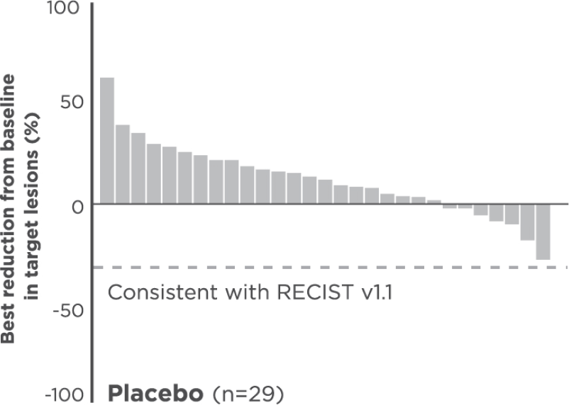Best reduction is maximum reduction in sum of diameters of target lesions. Patients with target lesion at baseline and at least 1 on-treatment tumor assessment are included. Some patients are not represented due to lack of evaluable postbaseline assessment, censoring before first evaluable postbaseline assessment, lack of target lesions, and/or incomplete or inevaluable target-lesion assessment. Data from time points after the first date of any of the censoring events defined for the primary PFS analysis were excluded.3