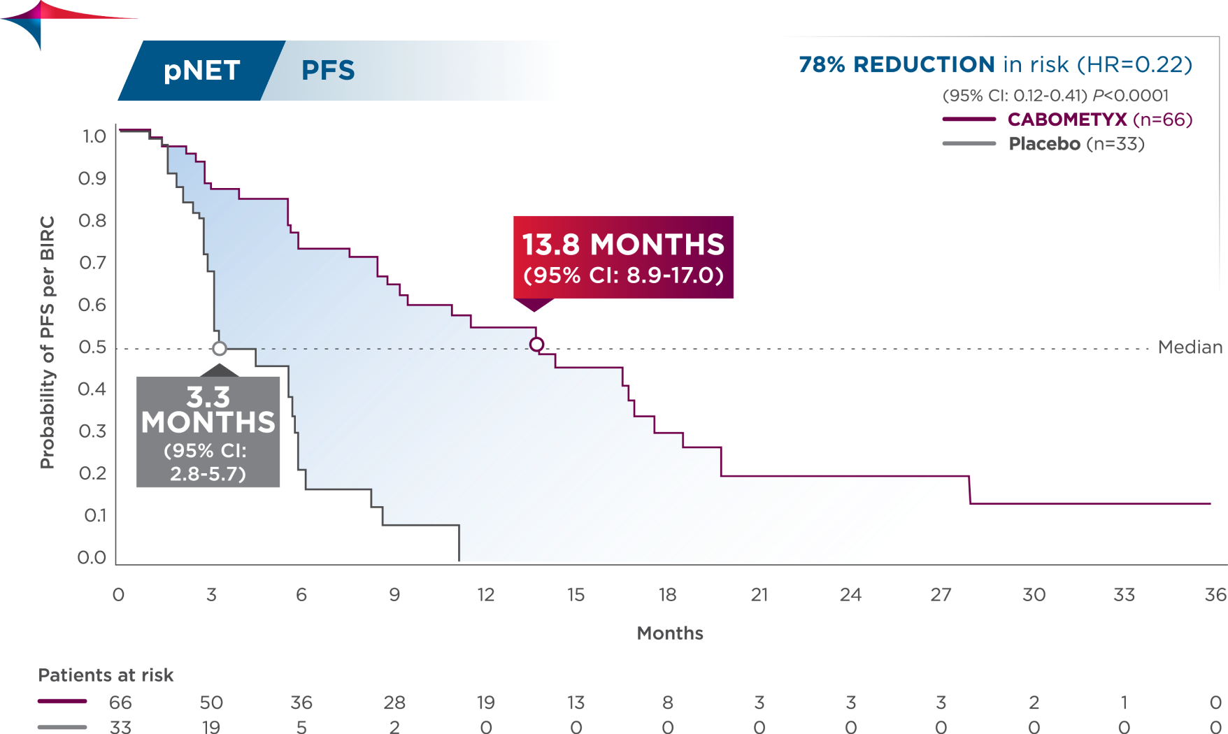 The CABINET trial was unblinded early and patients were allowed to cross over to open-label CABOMETYX regardless of whether they had experienced progression. A later updated OS analysis was conducted when 49 deaths were observed in the pNET cohort.